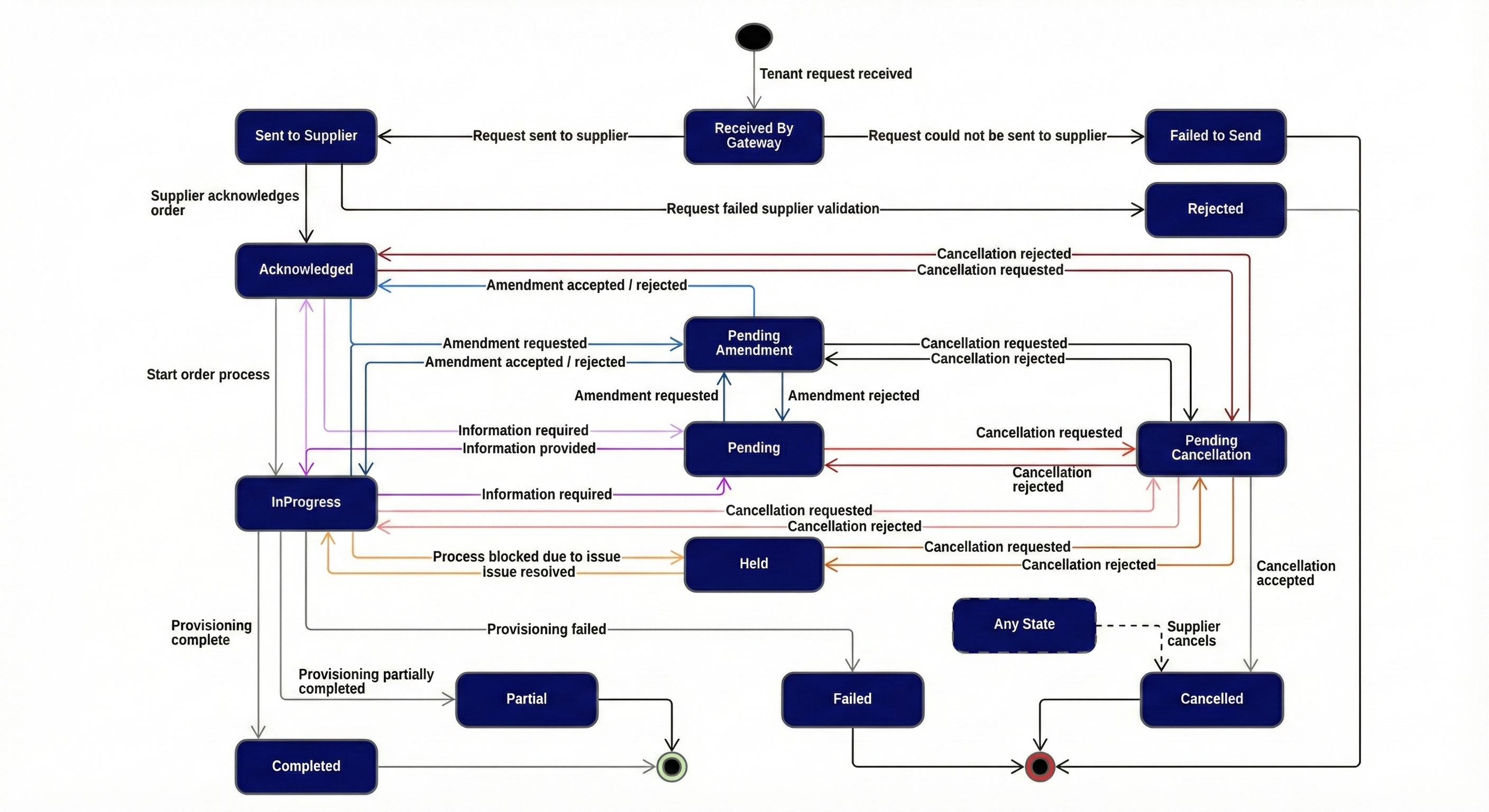 The order may be cancelled by the supplier at any time and move into this state. This state is also used when the tenant requests to cancel and the supplier accepts the cancellation. This is a terminal state.