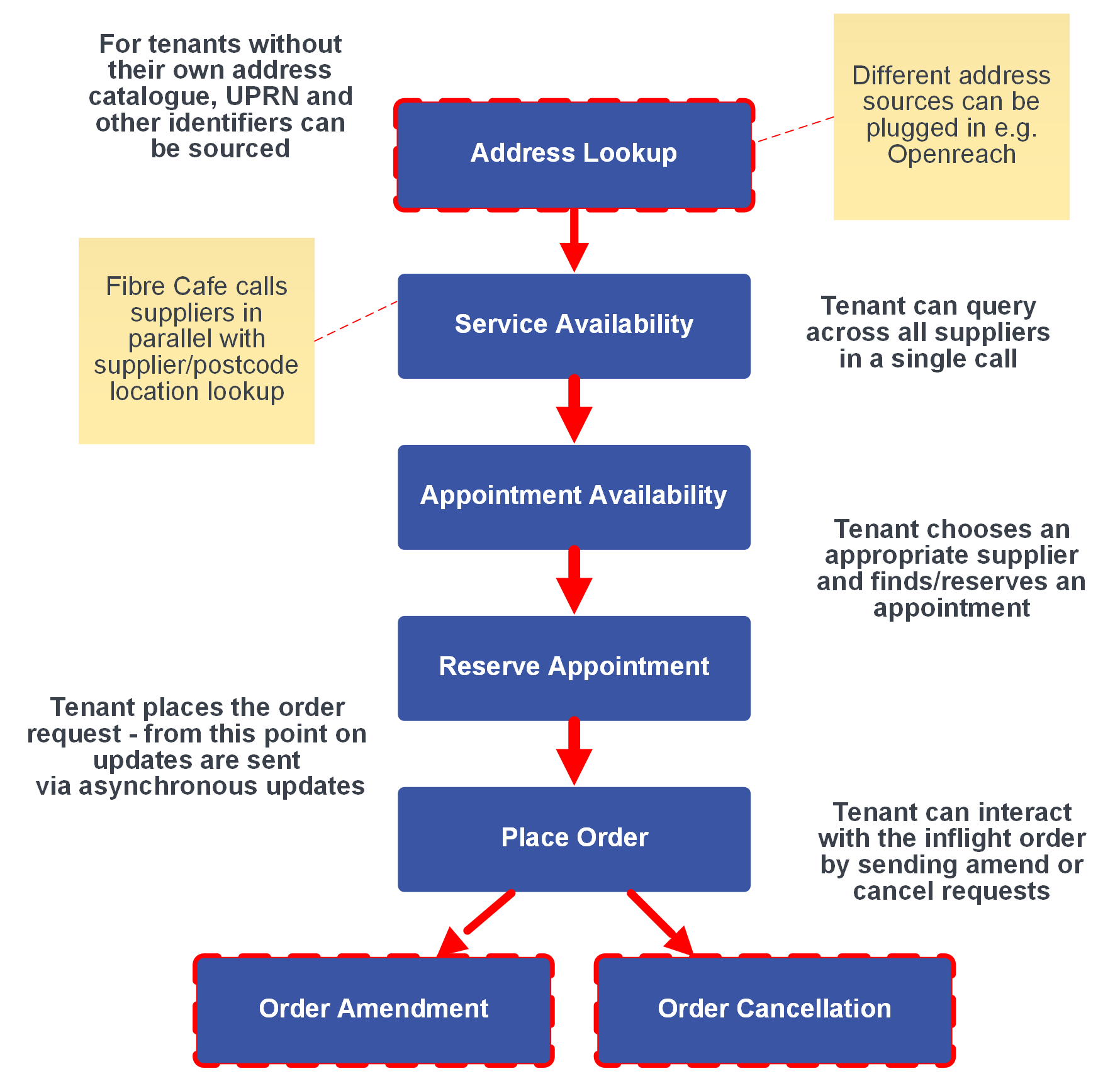 The end user checks available services at the address on customer systems provided by the tenant. The tenant submits the address identifiers of the end user’s location via the Fibre Cafe. The Fibre Cafe makes a call to one or more suppliers registered with the tenant who in turn respond with a list of any available services for the end-user’s location.