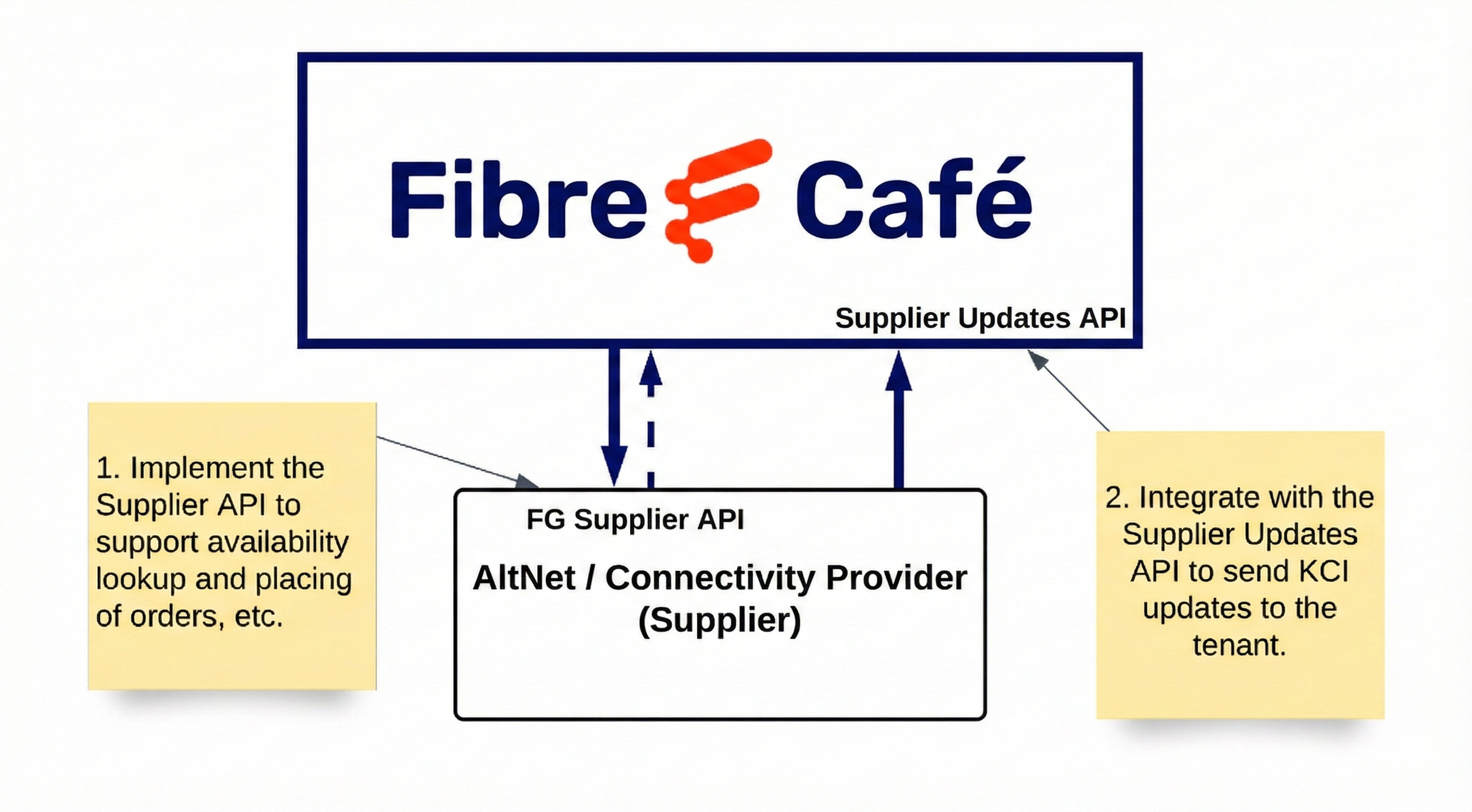 To send order updates, suppliers must integrate with the Supplier Updates API which the Fibre Cafe provides to send KCIs to tenants. Whilst pre-order checks are synchronous, order operations can be asynchronous and rely on this API in order to confirm or reject requests.