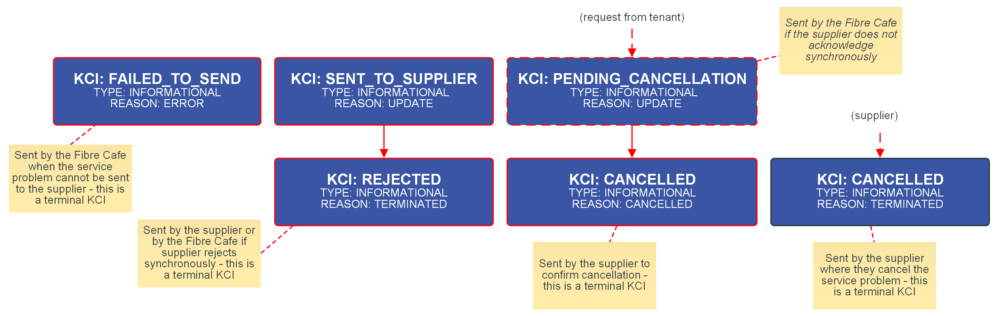 Where the tenant requests to cancel the service problem, the service problem may transition to "PENDING_CANCELLATION" awaiting supplier confirmation. A further KCI will then be sent to accept or reject the cancellation. Where the cancellation is rejected, the service problem would transition back to the previous state.
