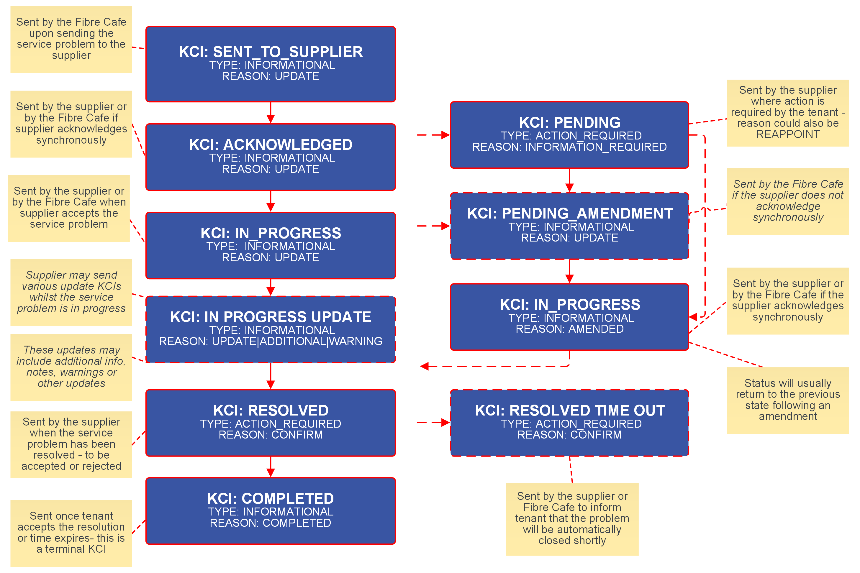 KCI updates will usually originate from the supplier API and be delivered by the gateway. However, to help ensure consistency between suppliers and to provide additional service problem state information, the gateway may also send some KCI updates. For example, a supplier may acknowledge the service problem synchronously as part of the create service problem API call - the gateway would then send the acknowledged KCI.