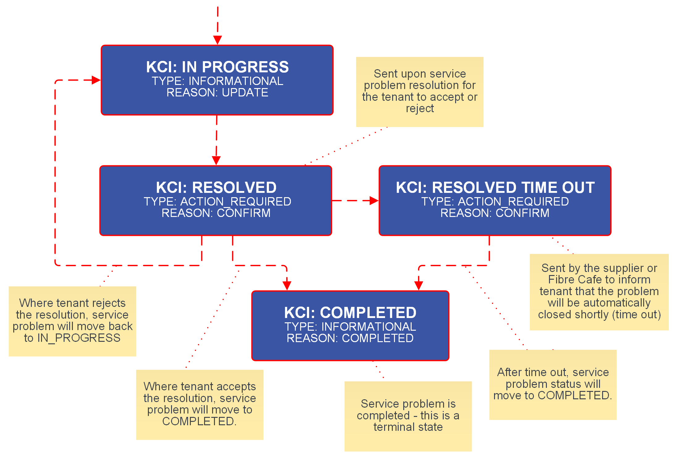 Once the service problem has been resolved by the supplier, the tenant can accept or reject the resolution using the service-problem-resolutions API. If the tenant accepts, then the service problem will move to COMPLETED and a KCI will be sent. If the tenant rejects the resolution, then the service problem will move back to IN_PROGRESS and a KCI will be sent. If the tenant does nothing then and ADDITIONAL KCI will be sent warning that the service problem will close in 24 hrs. The service problem will then move to COMPLETED by the supplier and a KCI will be sent.