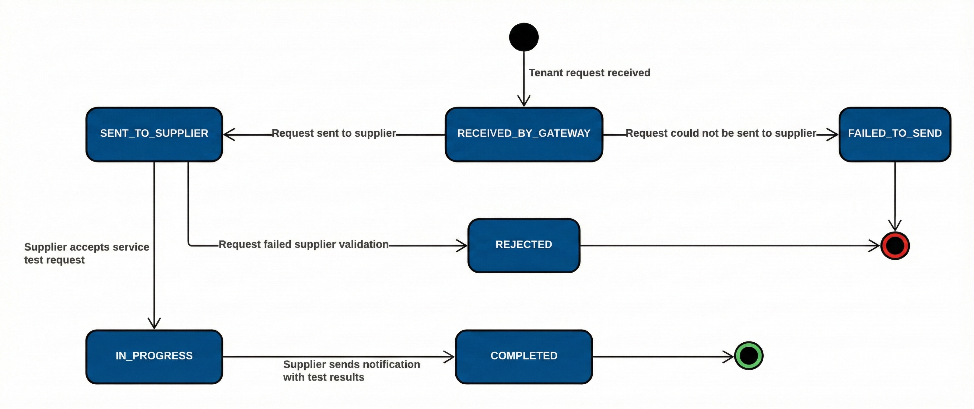 A service test request has been received by the gateway and has passed basic message validation by the gateway. The gateway will generate a service test identifier and return to the tenant. The message will be sent to the supplier.